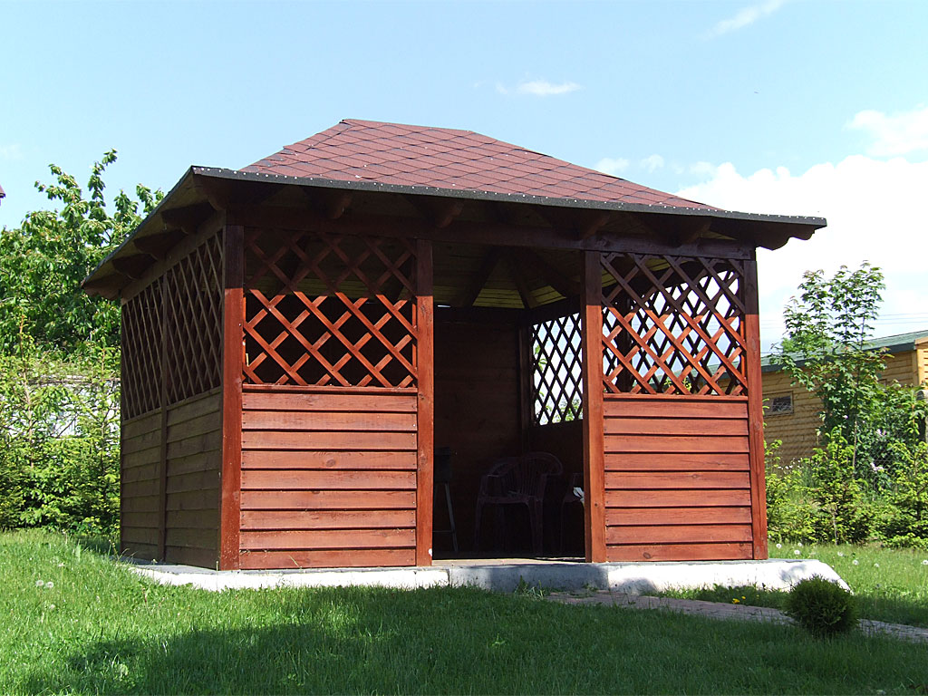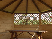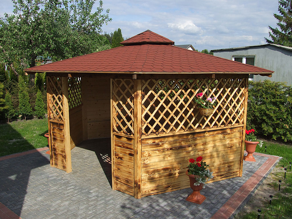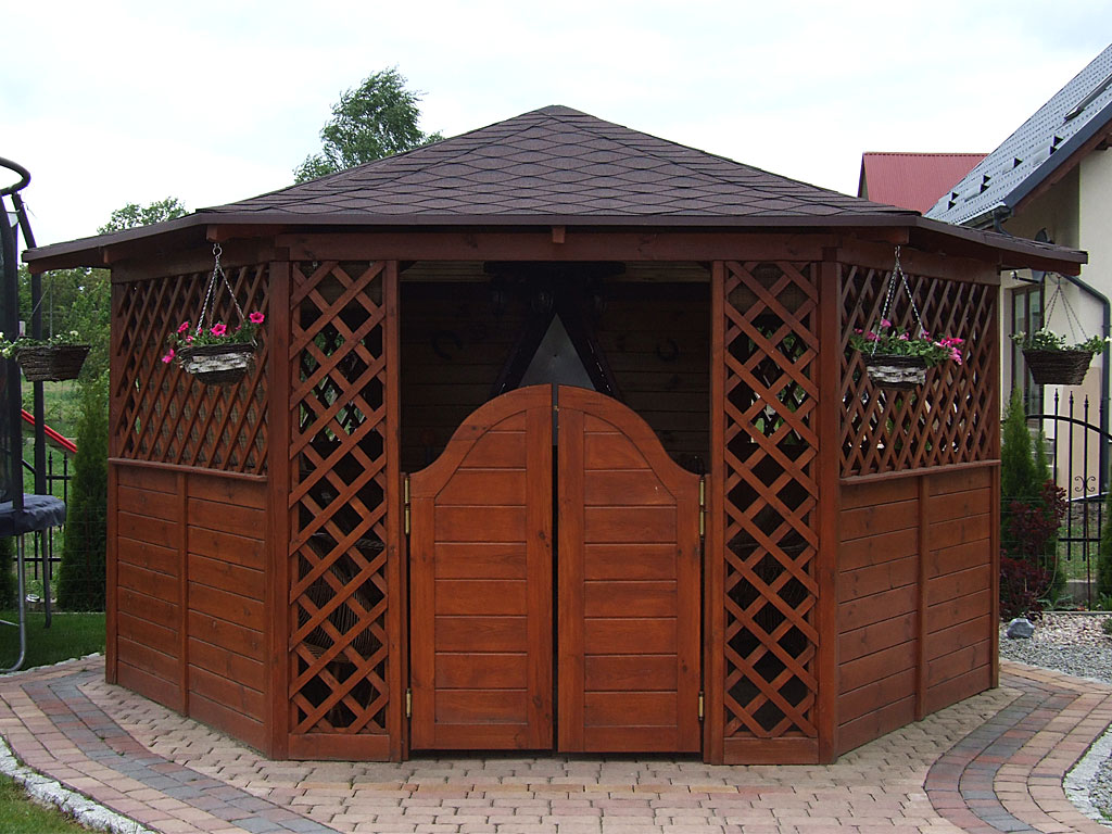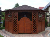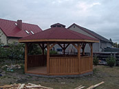 Altany ogrodowe wykonujemy z drewna litego o solidnych przekrojach, impregnowanego Drewnochronem lub Sadolinem; dach pokrywamy gontem bitumicznym. Koszt wykonania altany wynosi ok. 450zł/m2 z montażem.
